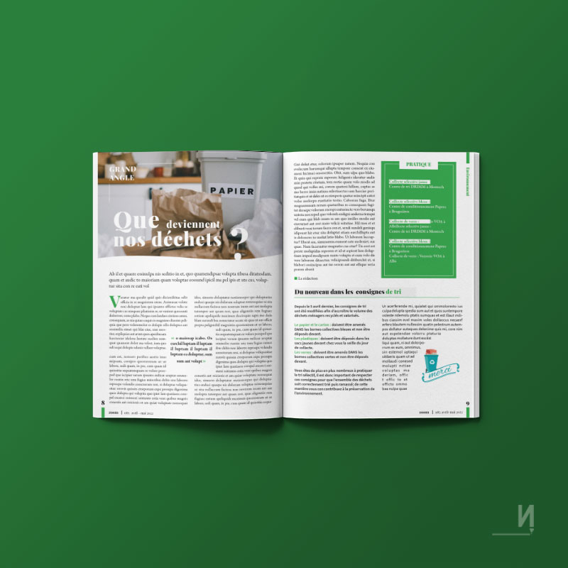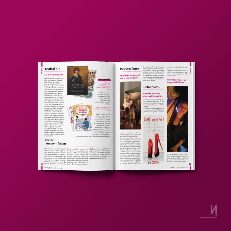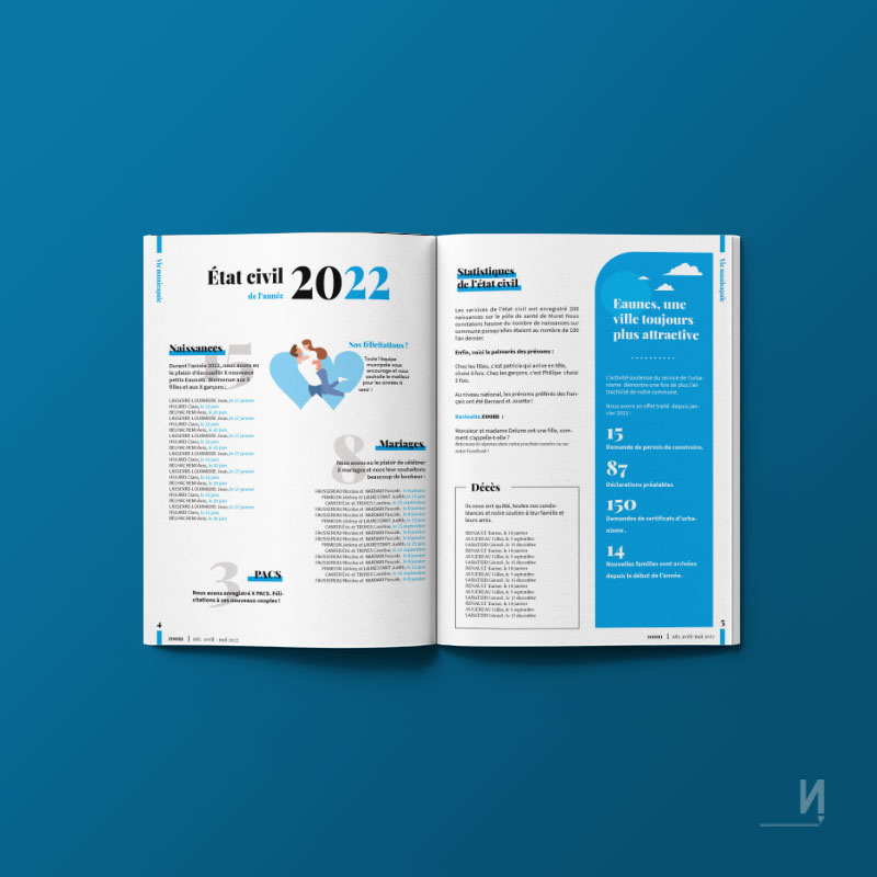 Maquette du magazine d'informations de la Mairie d'Eaunes. Conception d'une nouvelle charte graphique, mise en page, logo, structuration et architecture des informations.
